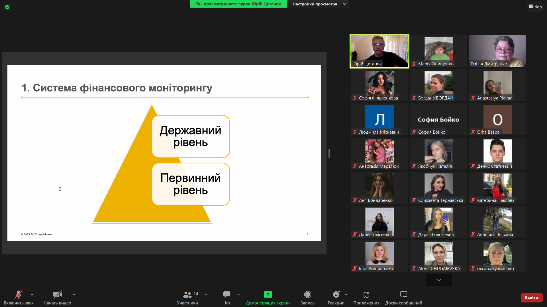 Зокрема Юрій Володимирович поділився цікавими кейсами зі своєї практичної діяльності як сертифікований аудитор і водночас суб’єкт первинного фінансового моніторингу та на конкретних прикладах розповів, як працює система фінансового моніторингу в Україні. Теоретичний матеріал лекції також було підкріплено практичними результатами діяльності суб’єктів державного