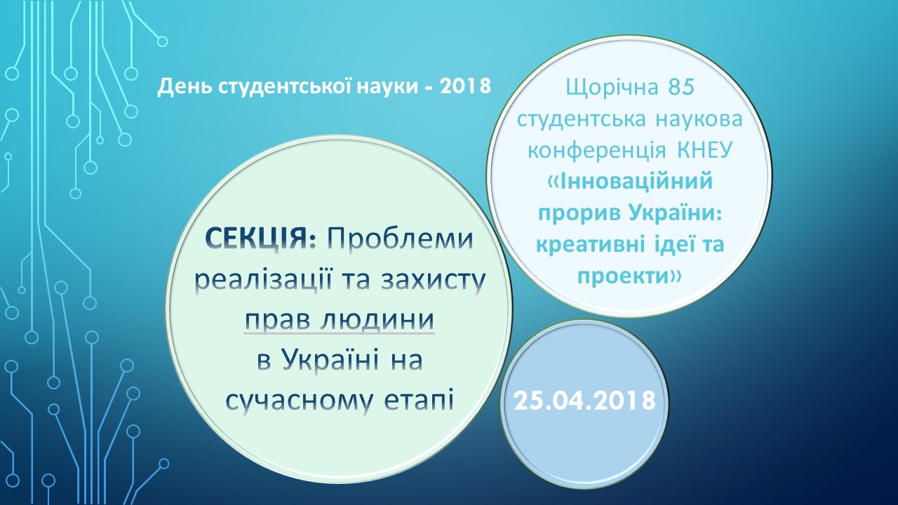Кафедра конституційного та муніципального права запрошує студентів до участі у роботі секції «ПРОБЛЕМИ РЕАЛІЗАЦІЇ ТА ЗАХИСТУ ПРАВ ЛЮДИНИ В УКРАЇНІ НА СУЧАСНОМУ ЕТАПІ» в межах щорічної 85 студентської наукової конференції КНЕУ «ІННОВАЦІЙНИЙ ПРОРИВ УКРАЇНИ: КРЕАТИВНІ ІДЕЇ ТА ПРОЕКТИ»