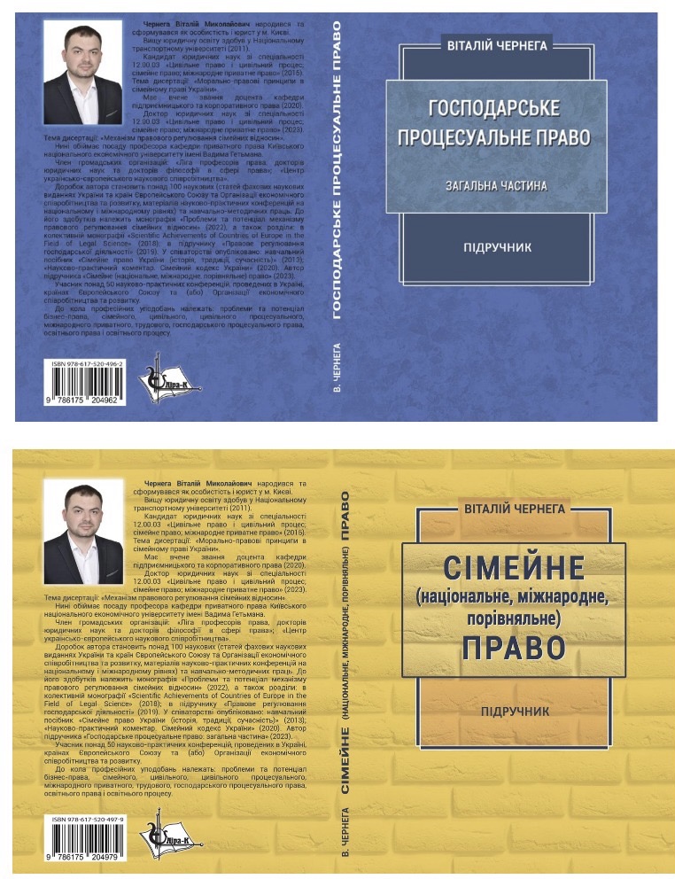 На початку квітня 2023 року відбулася значна подія в юридичному середовищі – побачили світпідручники «Господарське процесуальне право: загальна частина», «Сімейне (національне, міжнародне, порівняльне) право», автором яких є наш сучасник – доктор юридичних наук, доцент, професор кафедри приватного права Київського національного економічного університету імені Вадима Гетьмана Віталій Миколайович ЧЕРНЕГА.