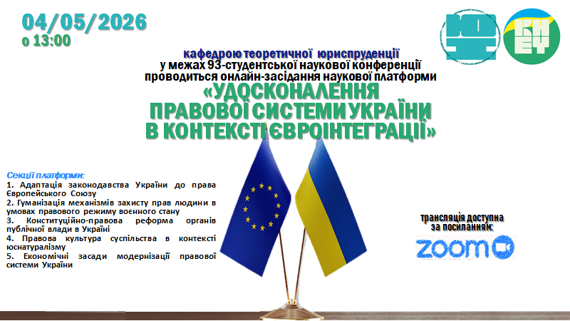 Кафедрою теоретичної юриспруденції у межах 93-студентської наукової конференції проводиться онлайн-засідання наукової платформи «УДОСКОНАЛЕННЯ ПРАВОВОЇ СИСТЕМИ УКРАЇНИ В КОНТЕКСТІ ЄВРОІНТЕГРАЦІЇ»30 Березня 2026р. |