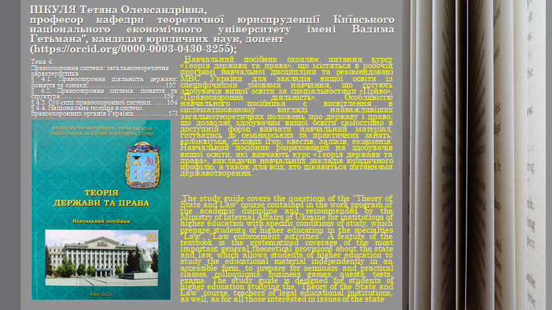 "Теорія держави і права" навчальний посібник (співавтор Пікуля Т.О.)18 Вересня 2023р. |