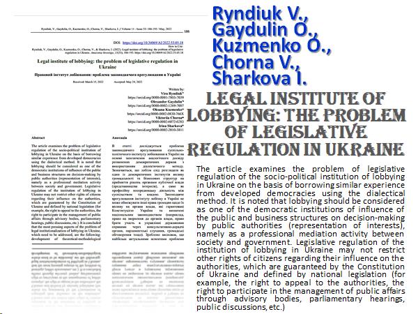 Legal institute of lobbying: the problem of legislative regulation in Ukraine. Нове видання:13 Вересня 2022р.