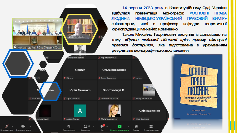 - 14 червня 2023 року в Конституційному Суді України відбулася презентація монографії: «ОСНОВНІ ПРАВА ЛЮДИНИ: НІМЕЦЬКО-УКРАЇНСЬКИЙ ПРАВОВИЙ ВИМІР» співавтором, якої є професор кафедри теоретичної юриспруденції Михайло Кравченко.