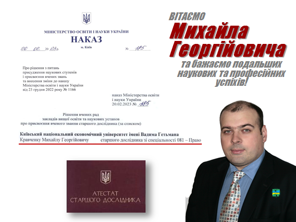 - Вітаємо Михайла КРАВЧЕНКА з присвоєнням вченого звання старшого дослідника зі спеціальності 081 «Право»!