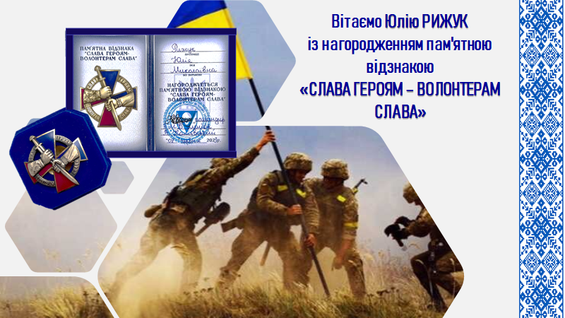 - Вітаємо Юлію РИЖУК із нагородженням пам'ятною відзнакою «СЛАВА ГЕРОЯМ – ВОЛОНТЕРАМ СЛАВА»