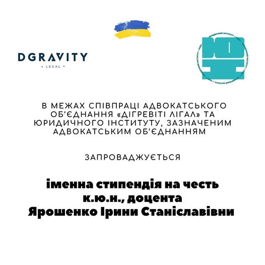 В межах співпраці Адвокатського об’єднанням «ДІГРЕВІТІ ЛІГАЛ» та Юридичного інституту КНЕУ імені Вадима Гетьмана, Адвокатським об’єднанням з метою формуванню позитивного іміджу інституту адвокатури та юридичної професії в цілому, а також для вшанування пам’яті к.ю.н., доцента Ярошенко Ірини Станіславівни, запроваджується стипендія на її честь для студентів Юридичного інституту.