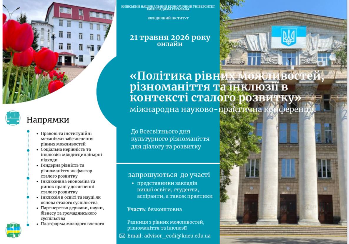 Юридичний інститут Київського національного економічного університету імені Вадима Гетьмана та Радниця з рівних можливостей, різноманіття та інклюзії Київського національного економічного університету імені Вадима Гетьмана запрошують 21 травня 2026 року взяти участь у роботі міжнародної науково-практичної конференції «Політика рівних можливостей, різноманіття та інклюзії в контексті сталого розвитку».